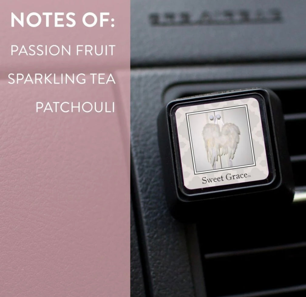 Sweet Grace is voted #1 best selling fragrance. It’s the perfect scent for year round. The scent is exotic passion fruit, sparkling tea, and classic patchouli. Warm, peaceful, and pure is how this company likes to describe it. 0.1oz. Simply pop out the vent clip, turn dial to open, clip to car vent, and enjoy your new fresh fragrance! Last up to 30 days.