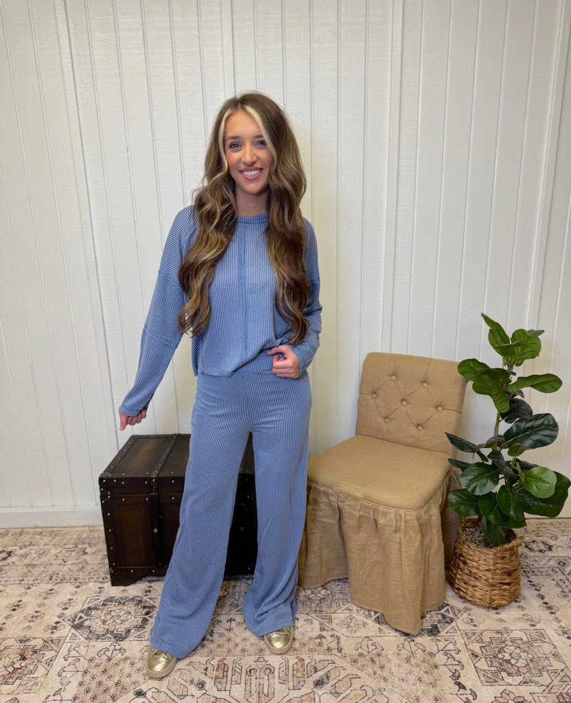 Denim blue matching set with raw trim detail. Model is wearing her true size small. 70% polyester, 23% rayon, 7% spandex