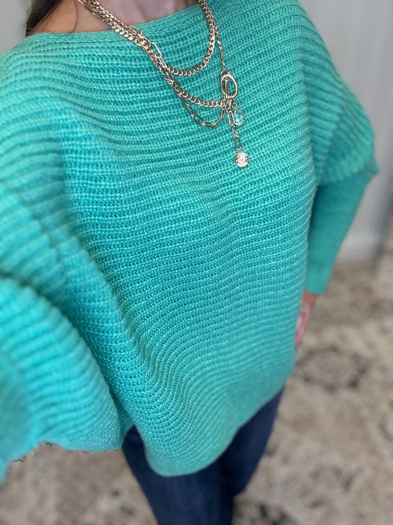 Knit sweater that comes in two color options, kelly green and taupe. 79% polyester, 2% acrylic