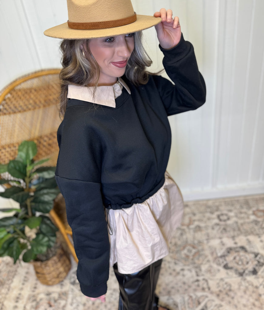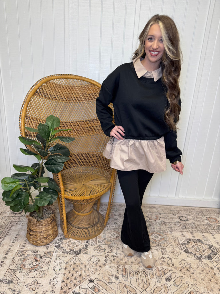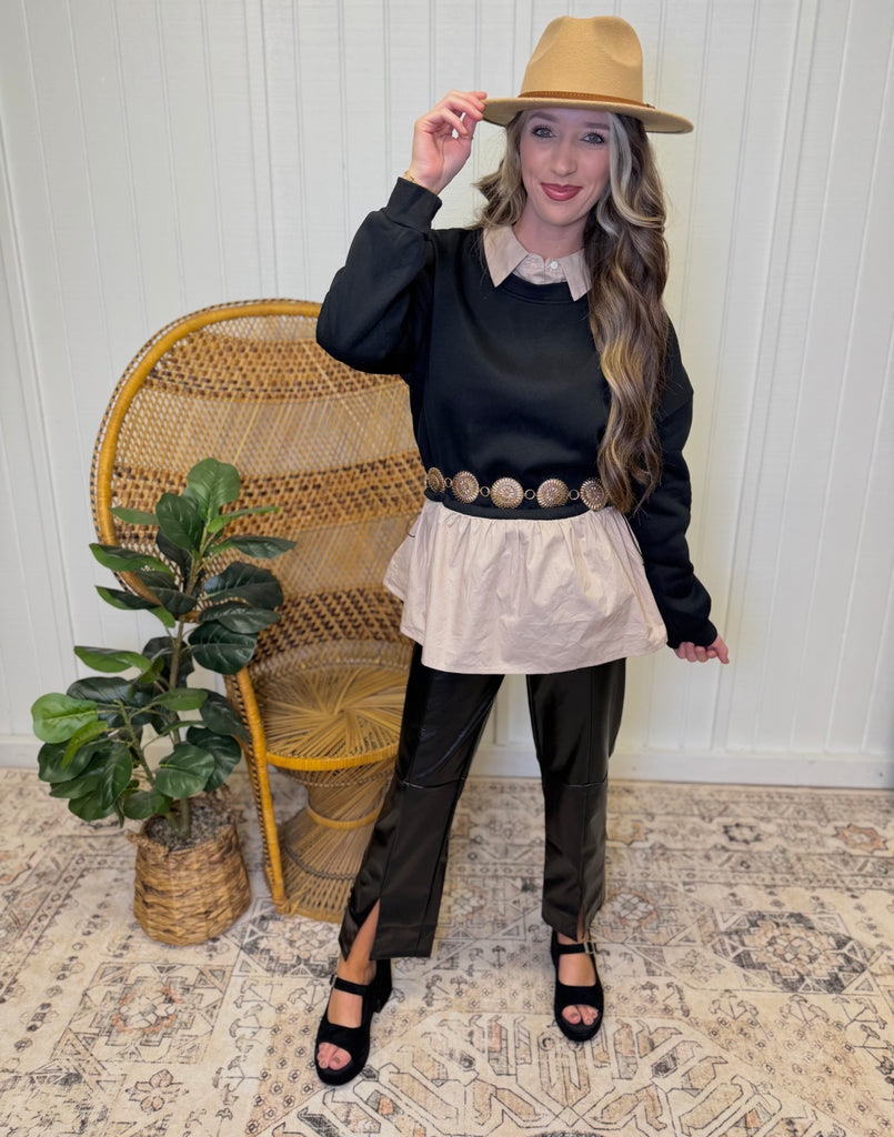 How stinking cute is this look? Dress this top up or down but either way you’ll be trendy and comfy. Black sweatshirt with built in tan woven collard top. Model is wearing a size small. Self: 100% polyester. Contrast 1: 95% polyester, 5% spandex. Contrast 2: 100% polyester