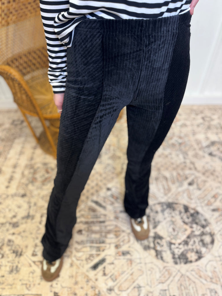 Velvet ribbed flare leggings in the color black. Model is wearing a size small. 95% polyester, 5% spandex