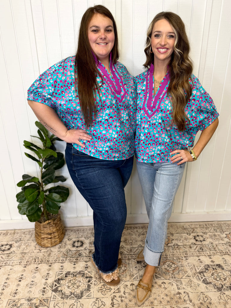 Jade blouse with magenta leopard print and scrunched sleeve detail. So lightweight and flowy. True to size fit, models are wearing a small and 2x. Self: 85% rayon, 15% nylon. Contrast: 80% polyester, 20% cotton