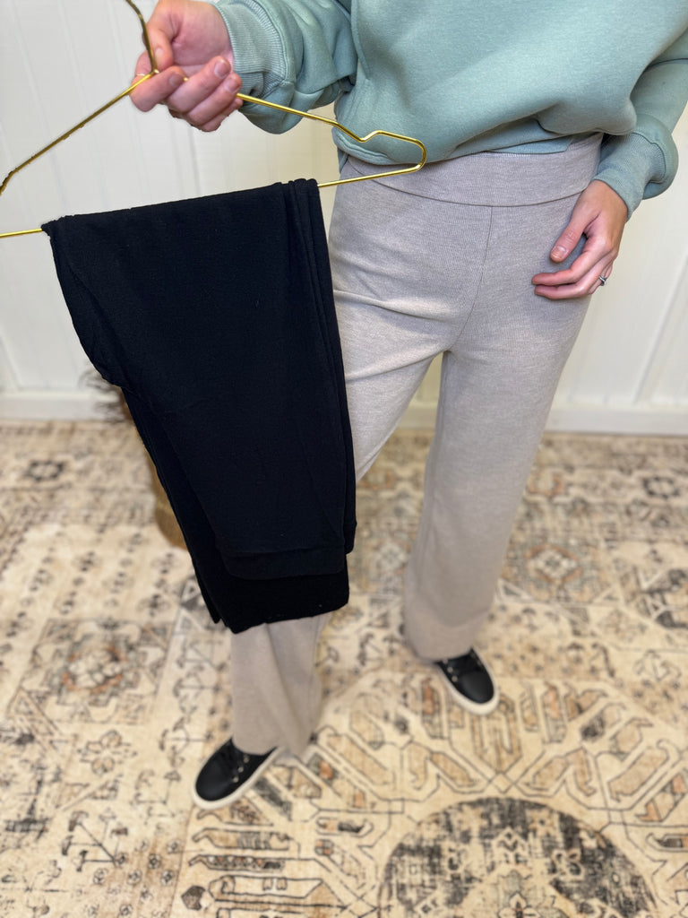 Buttery soft lightweight cozy pants with roll down waist line. So comfortable and perfect to style with an endless amount of opportunities. Model is wearing a size small. Comes in two color options, black and tan. 39% polyester, 31% nylon, 28% rayon, and 2% spandex