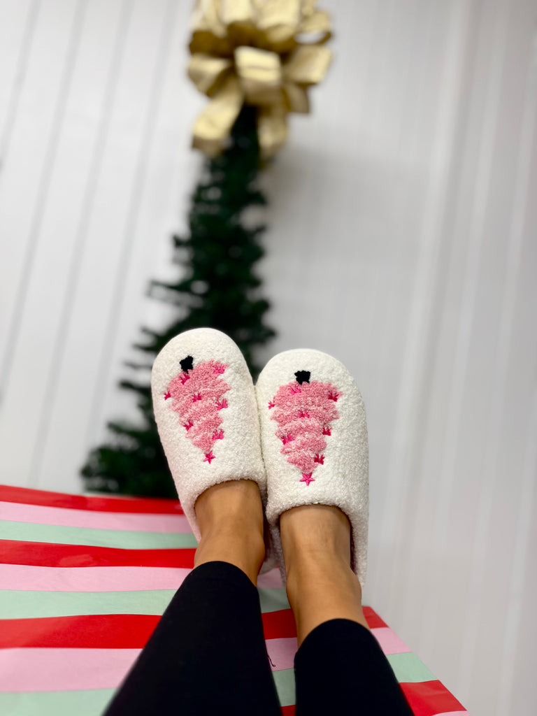 Fuzzy white slippers with pink Christmas tree. One size fits most.