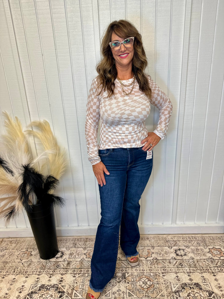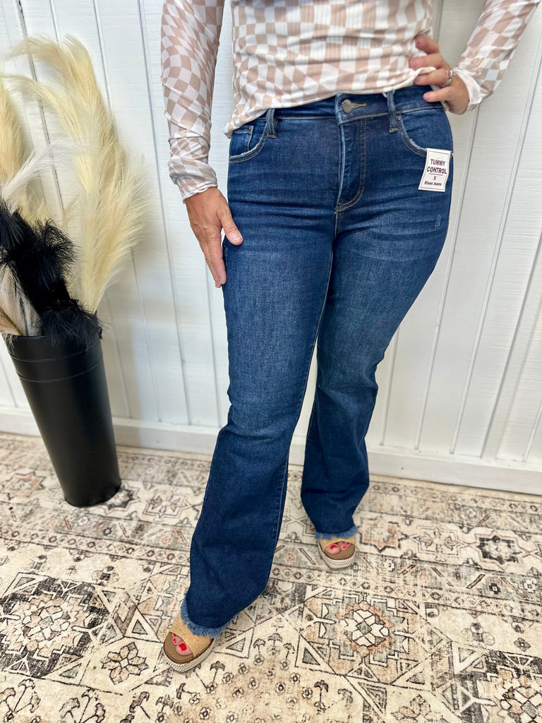 Risen Jeans Brand. Tummy control dark denim mid rise frayed hem flare jeans. Model is wearing a size 7. 72% cotton, 26% polyester, 2% spandex