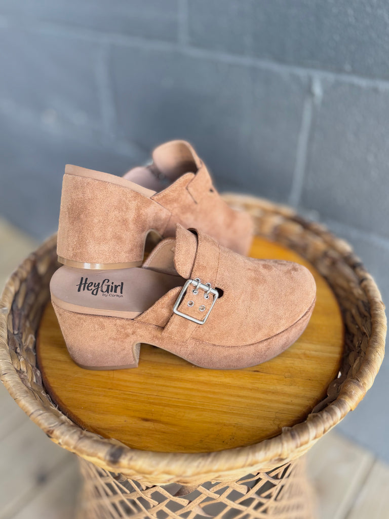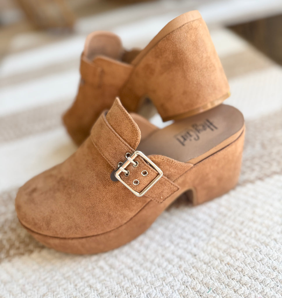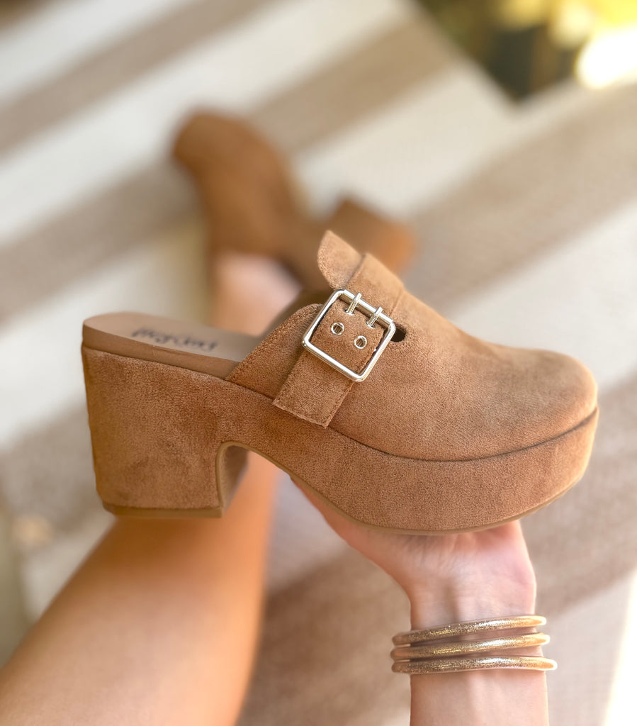 Corkys Footwear. Tabacco camel suede cozy platform clogs with memory foam padding. True to size fit, we half size we recommend sizing up.