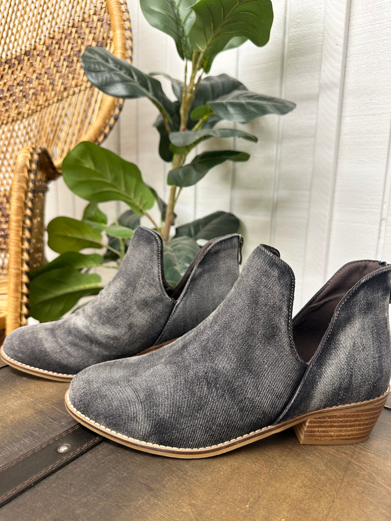 Corkys Footwear. Dark black washed denim booties with back zipper and memory foam padding. True to size fit, if half size we recommend sizing up.