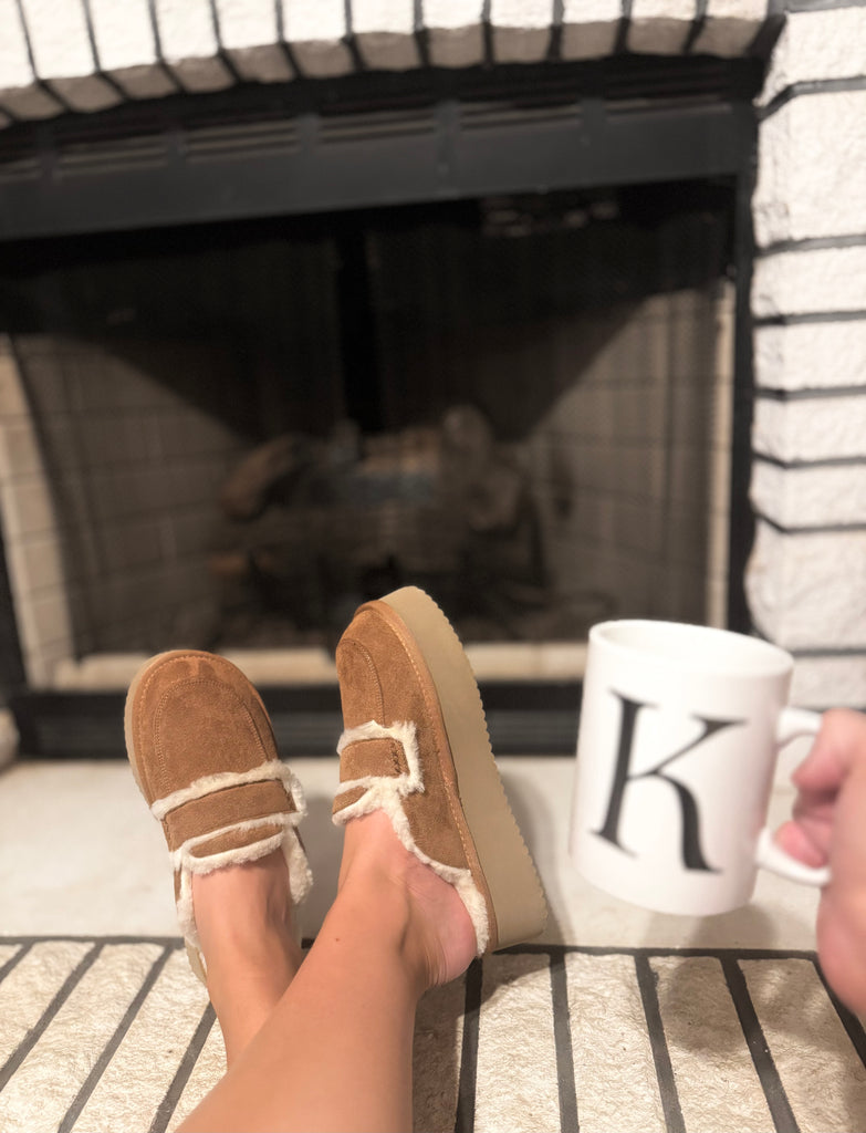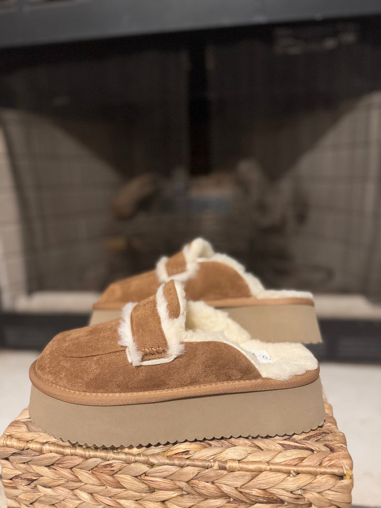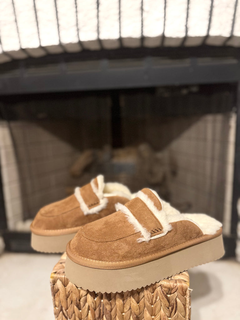 Corkys Footwear. Tobacco faux suede slippers with soft and fuzzy lining. Easy slip-on design with chunky platform sole that’s perfect for inside and outside wear. True to size fit, if half size we recommend sizing up.
