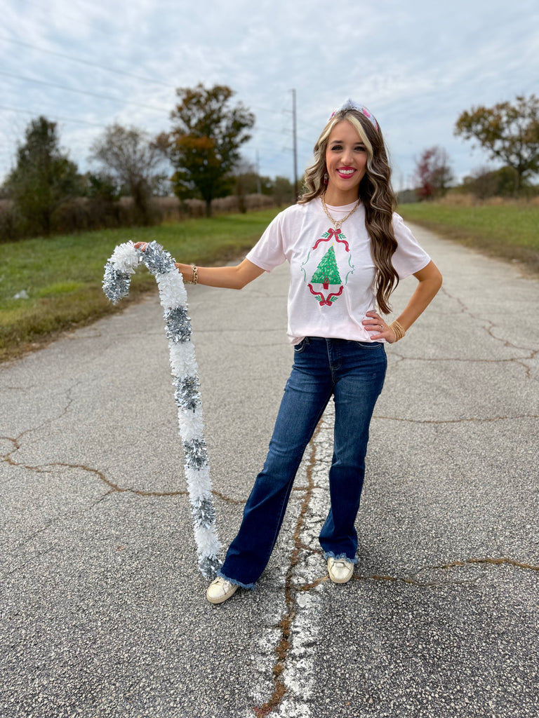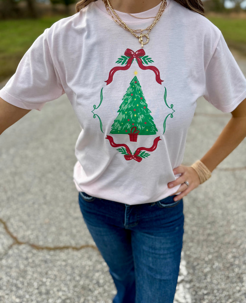 Light pink buttery soft lightweight short sleeve tee with Christmas tree graphic. True to size fit. 50% polyester, 25% cotton, 25% rayon
