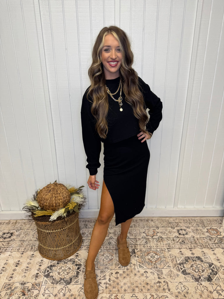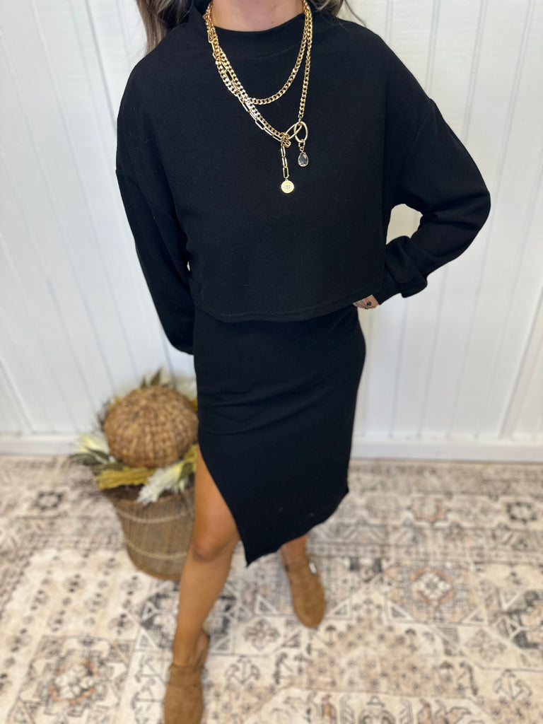 Black tank top style layering dress with side slit and black cropped long sleeve top. This matching set is a perfect combo and also perfect to wear separately. True to size fit. 37% polyamide, 36% polyester, 25% rayon, and 2% spandex