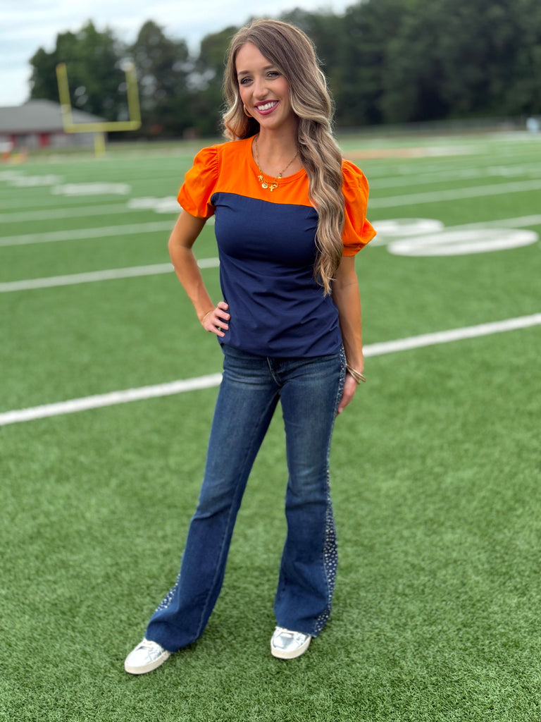 Orange and navy buttery soft top. True to size fit. 60% cotton, 40% modal