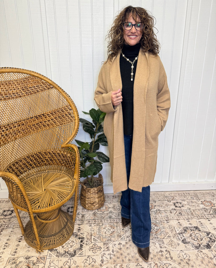 Camel long sweater cardigan with pockets. Model is wearing a size small. 80% acrylic, 17% nylon, 3% spandex